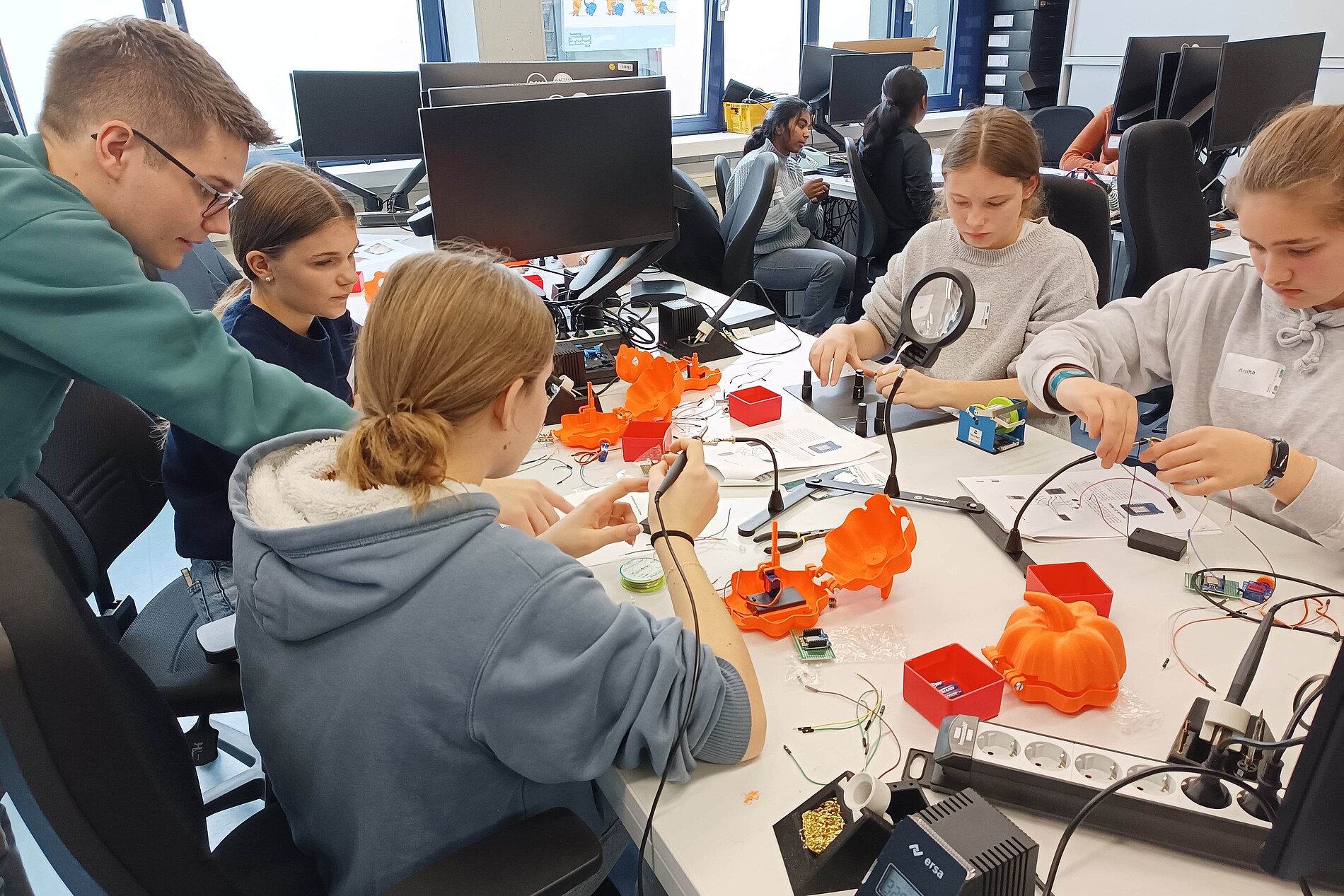 Gemeinsam werfen wir einen Blick in verschiedene technische Studiengänge und Berufe und erleben diese in abwechslungsreichen Workshops hautnah. Dabei können die Mädchen beispielsweise Motion-Capture-Bodysuits und Haptik-Westen testen, sich im Flugsimulator als Pilotin oder beim digitalen Schweißen ausprobieren oder ein eigenes „Smart Lightboard“ fertigen.